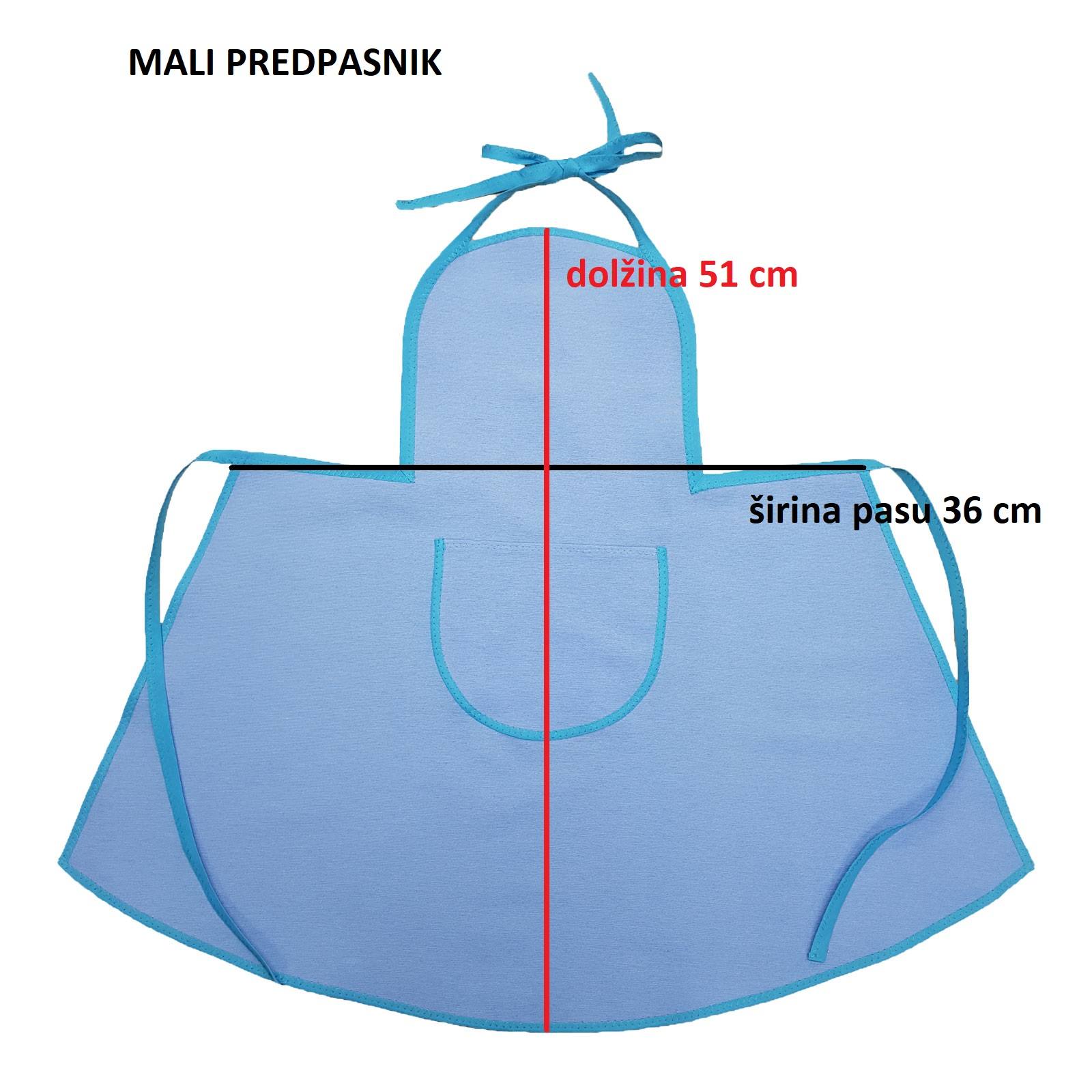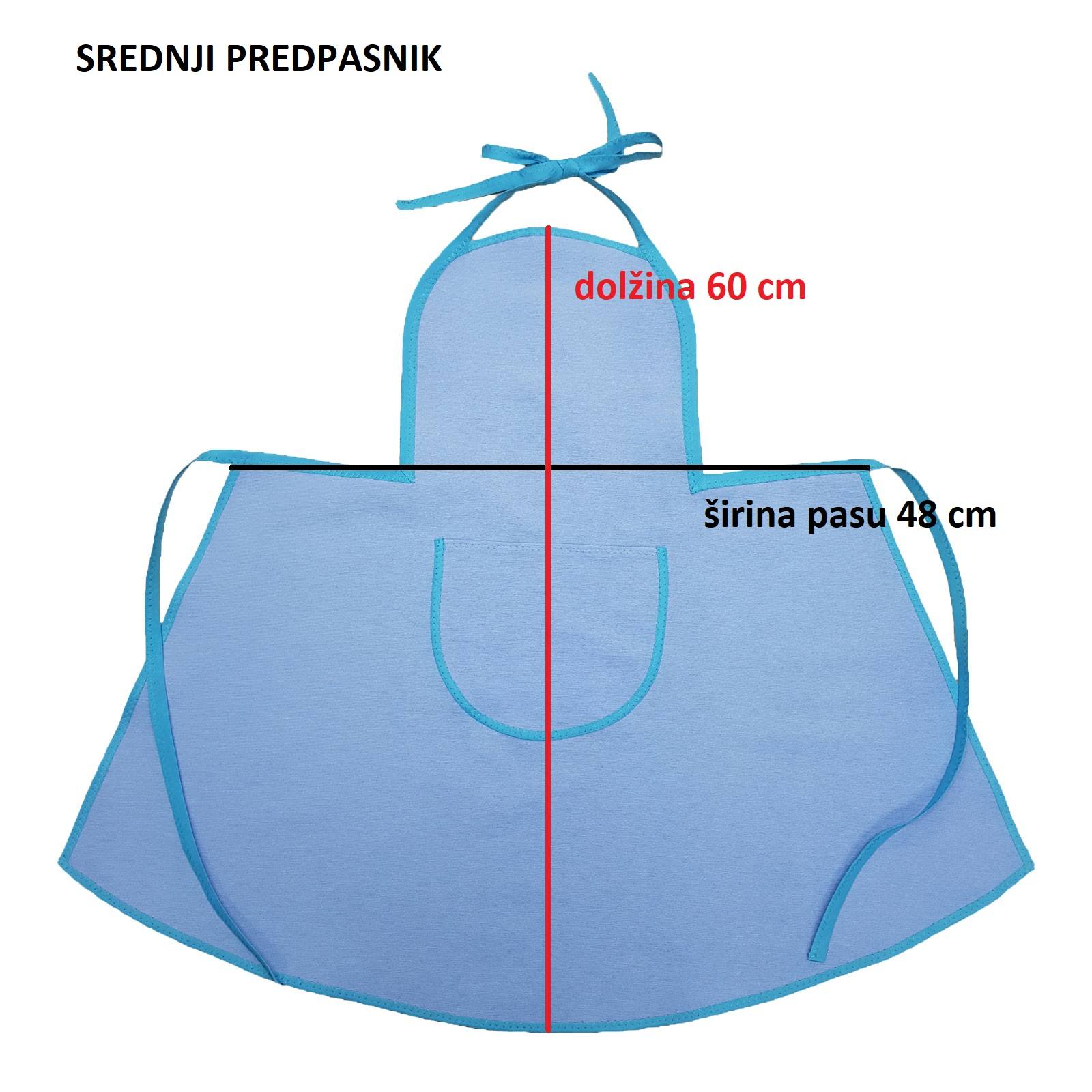 Izbirate med tremi velikostmi predpasnikov. Predpasniki se vežejo s trakovi, zato so tudi nekoliko prilagodljivi. Leta pri opisu velikosti so približek, za ustrezno naročilo glejte zapisane velikosti v cm. Prikaz velikosti najdete tudi med slikami izdelka.